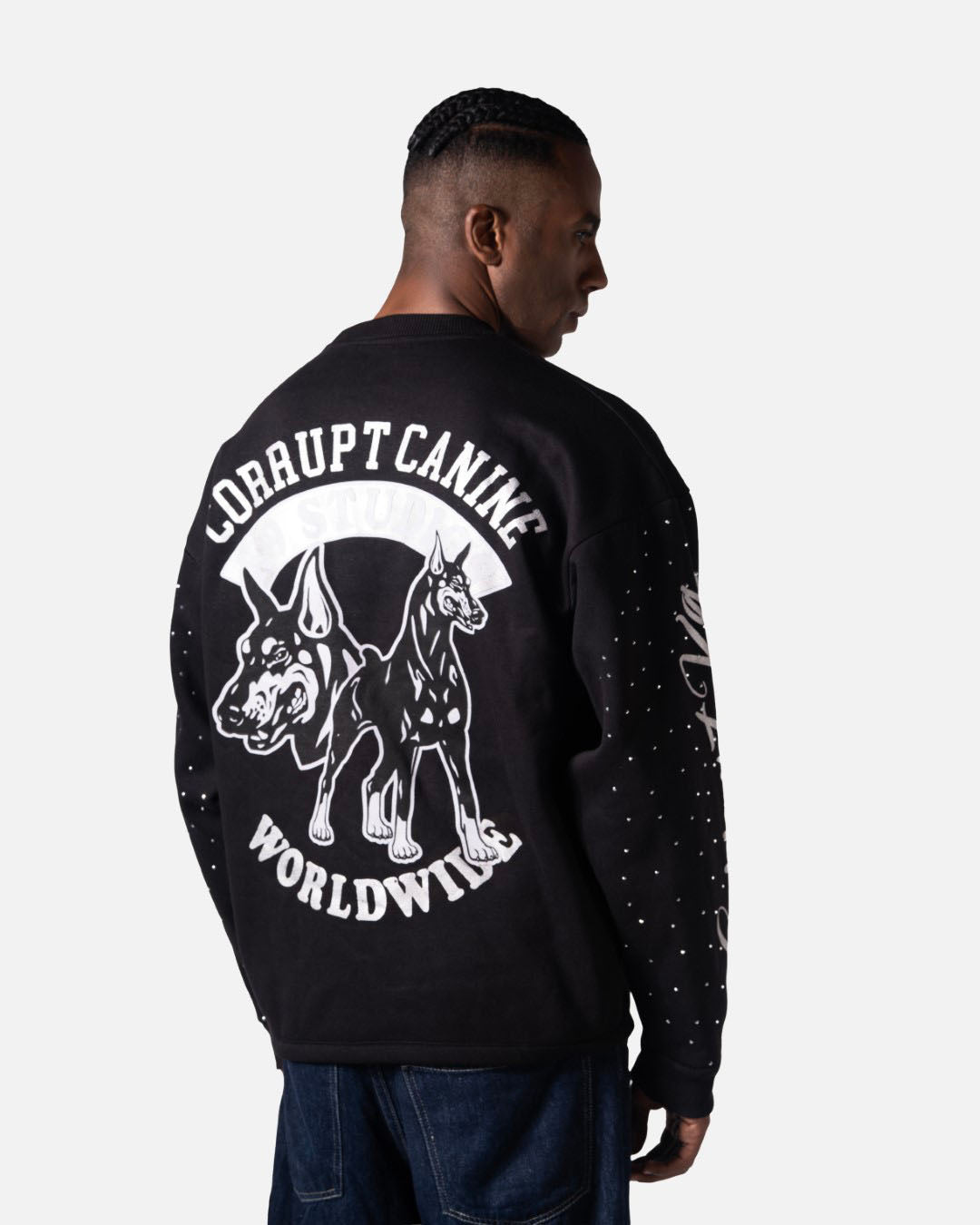 RHINESTONE CORRUPT K9 ROUND NECK LONG SLEEVE SWEATSHIRT